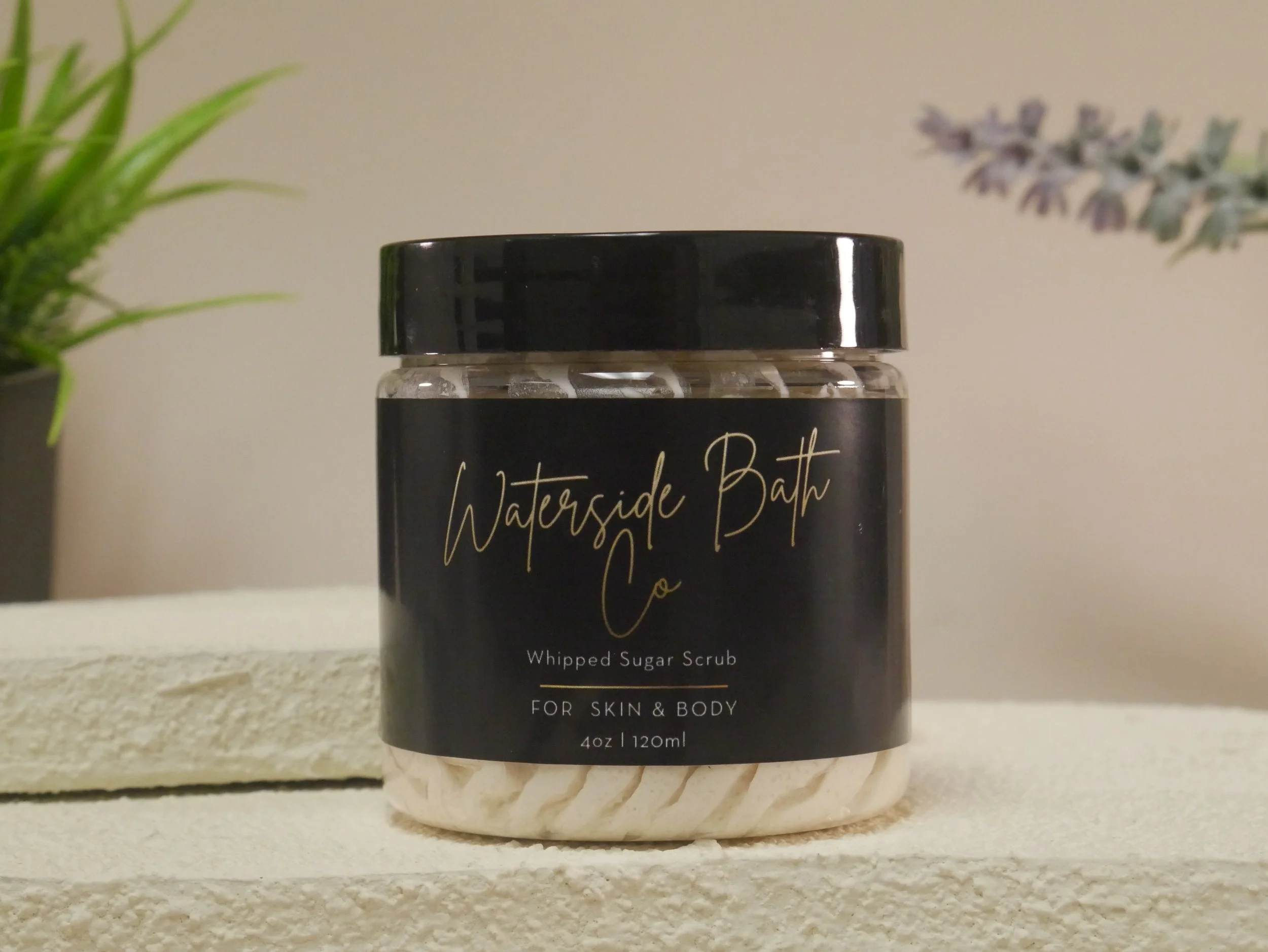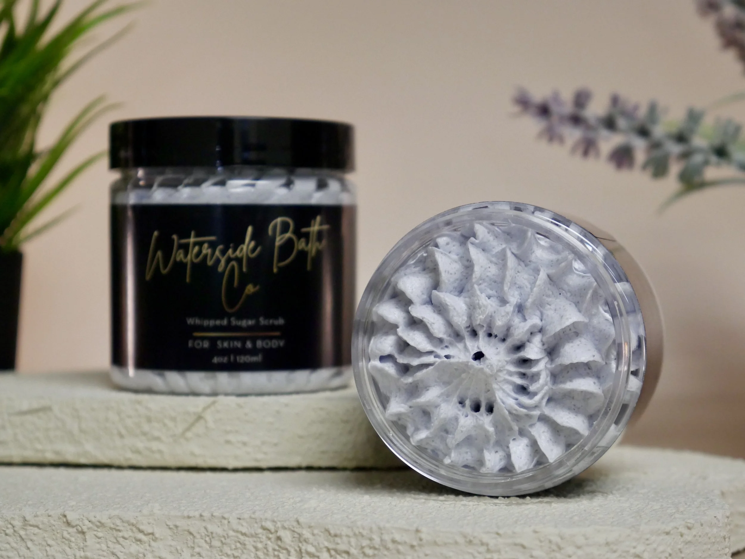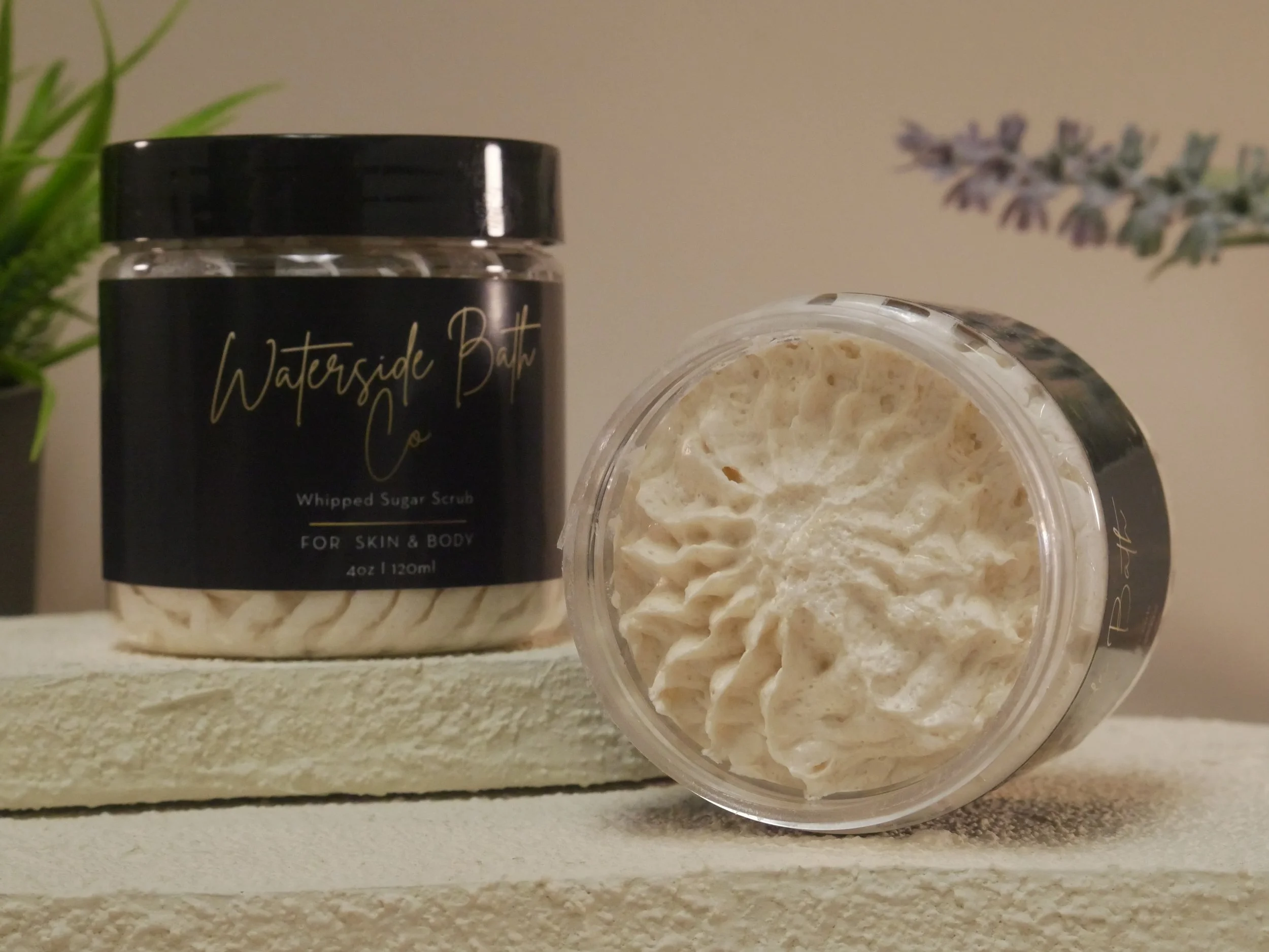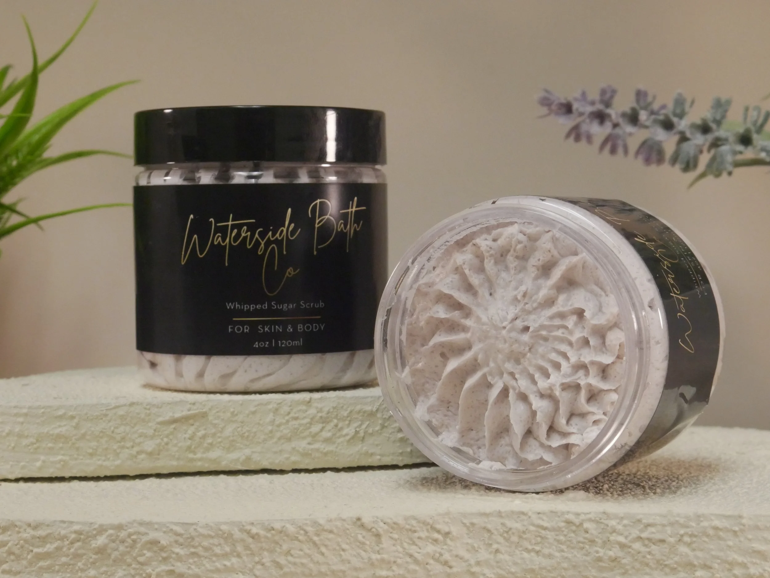 Hand Made Whipped Sugar Scrub. This scrub contains whipped soap base to gently clean and exfoliate as well as Avocado oil to hydrate skin in one step. Your skin will feel refreshed & silky after every shower or bath.