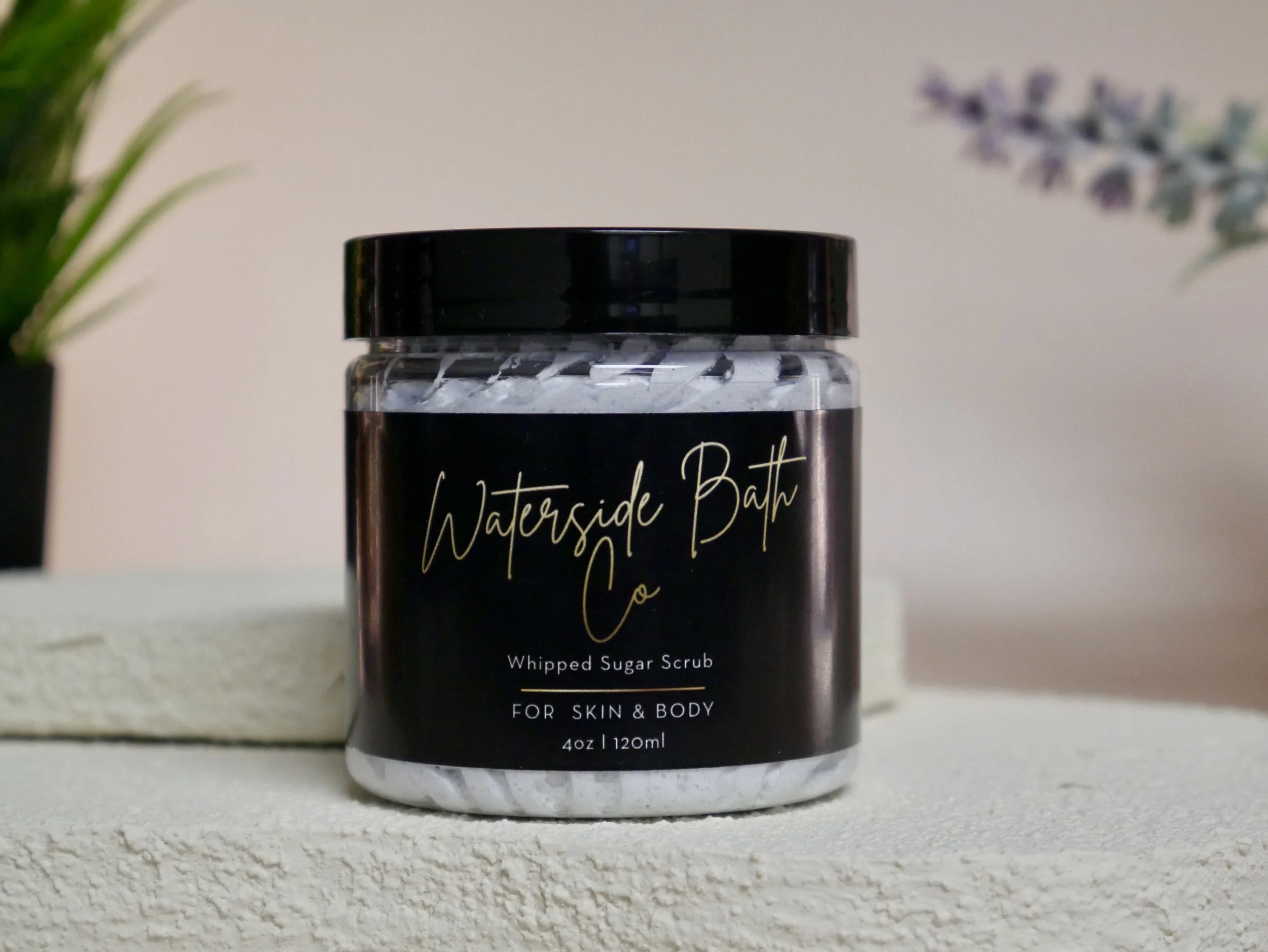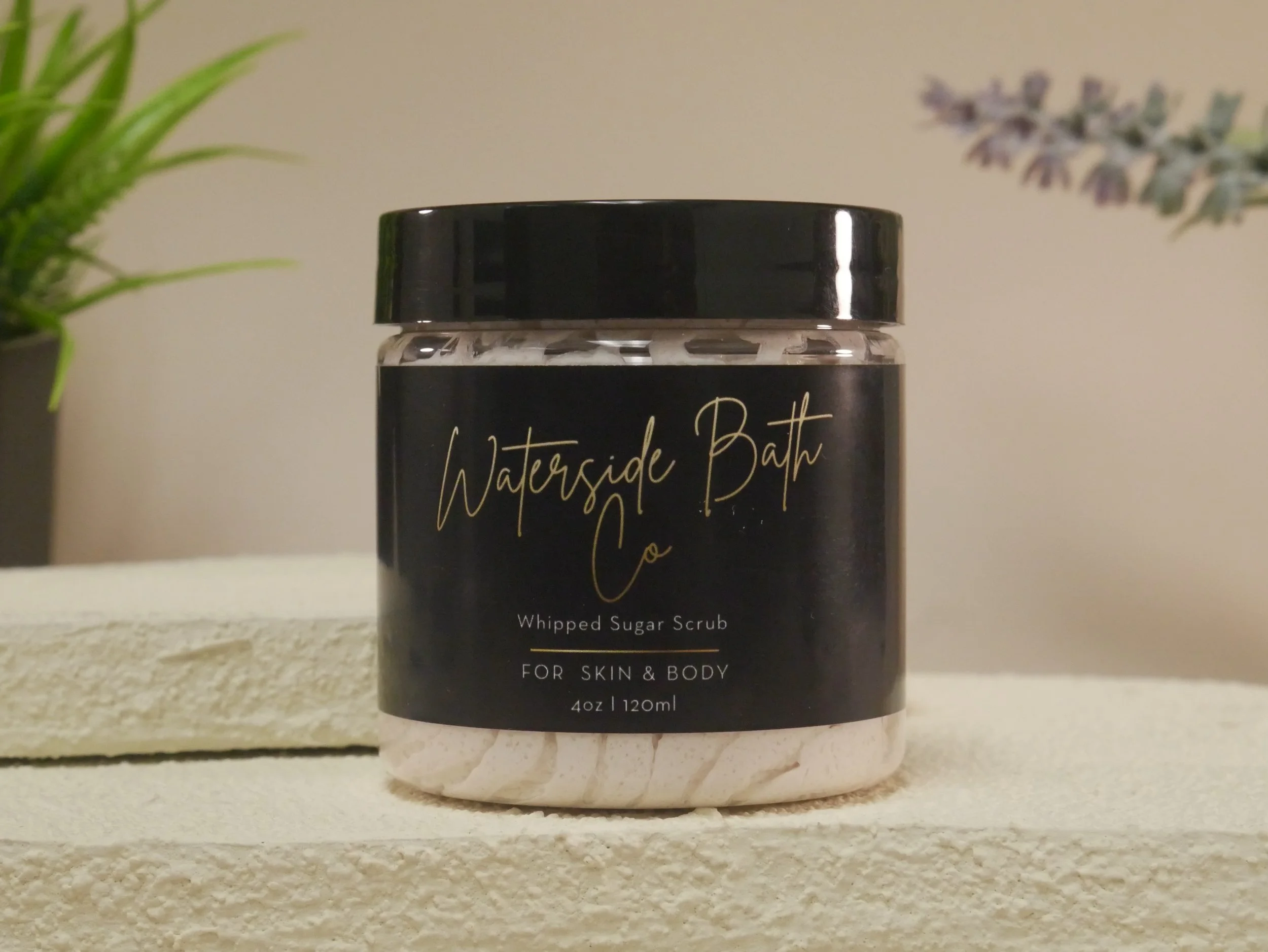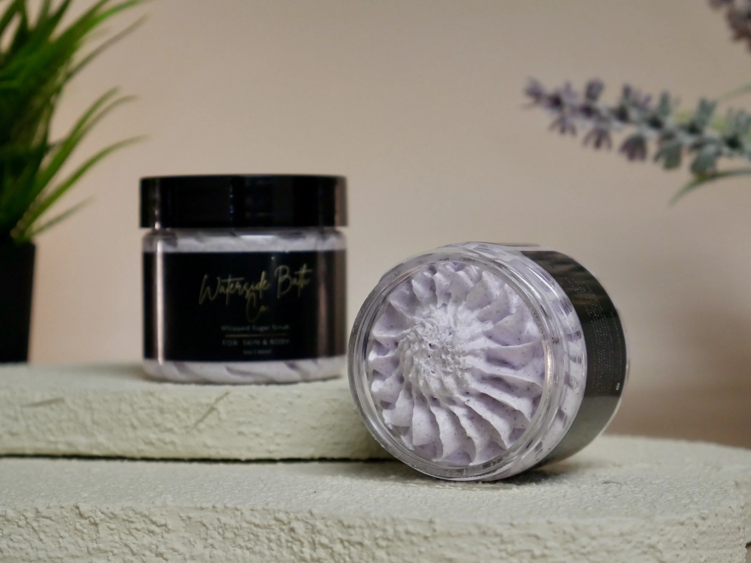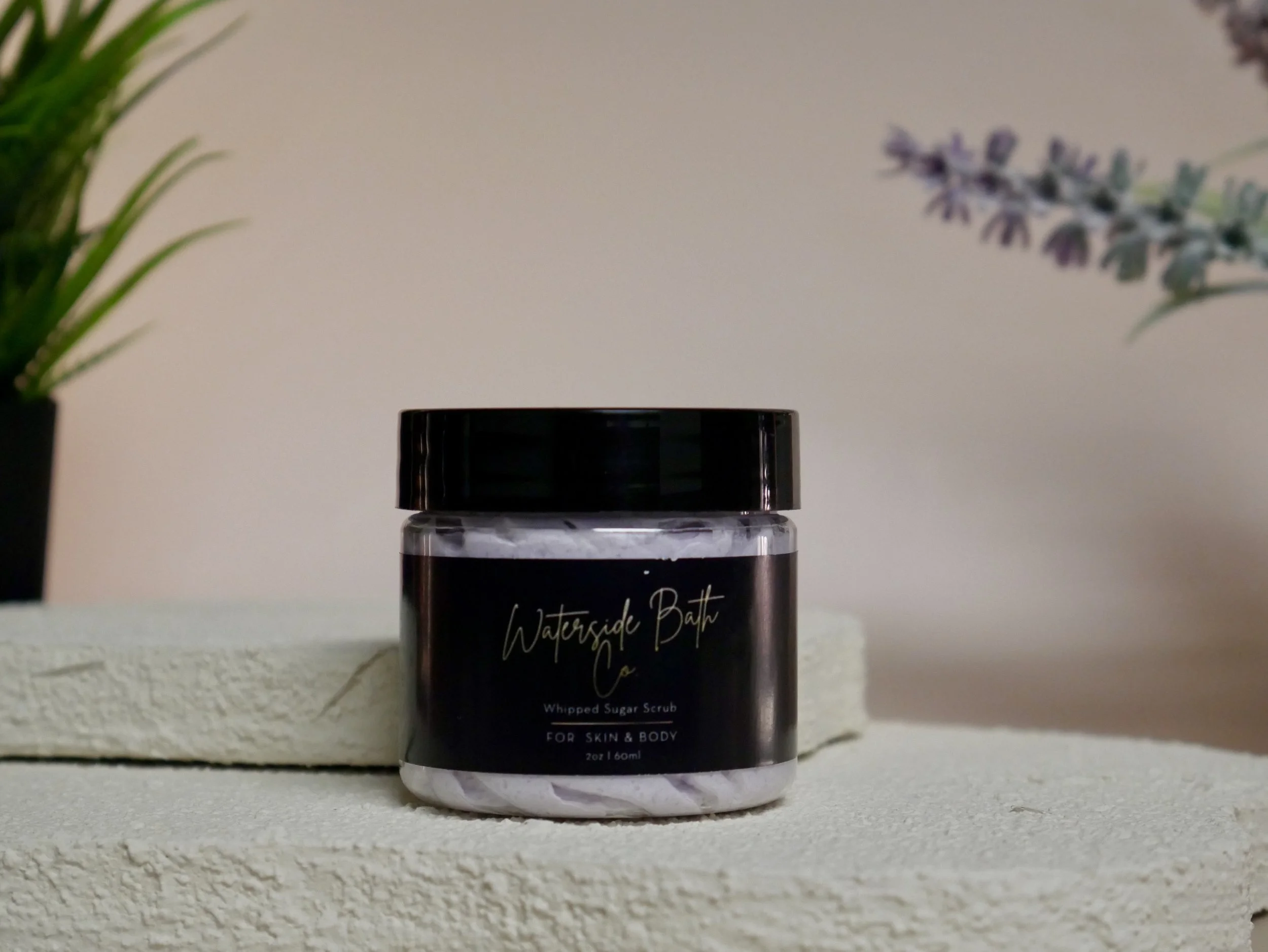 Hand Made Whipped Sugar Scrub. This scrub contains whipped soap base to gently clean and exfoliate as well as Avocado oil to hydrate skin in one step. Your skin will feel refreshed & silky after every shower or bath.